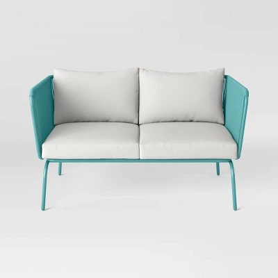 Style a resort-worthy entertaining area on your deck or patio with the help of this Fisher Patio Loveseat from Project 62â„¢. Featuring a classic midcentury design with woven cord construction on a rust-resistant steel frame, this padded patio loveseat provides comfortable seating for two in a bold blue-green color palette that will instantly upgrade your outdoor entertaining space. The tall back and armrests along with included seat and back cushions provide a comfortable spot to rest and relax, while the metal frame is finished with rust-resistant qualities to keep it looking great longer. Just add a coordinating coffee table so you have a place to put drinks and snacks while you enjoy your outdoor oasis.