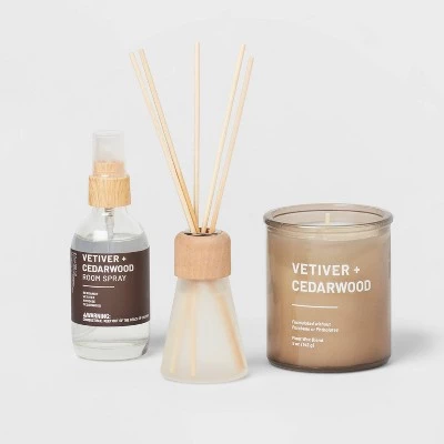 Elevate your everyday life with the 3pk Diffuser Candle Room Spray Gift Set Vetiver Cedarwood from Project 62™. Whether it’s your living room, bedroom, or workspace, this set effortlessly transforms your environment into a haven of relaxation and balance. This Project 62™ 3pk Diffuser Candle Room Spray Gift Set Vetiver Cedarwood diffuser’s sleek and modern aesthetics seamlessly complement any decor style, making it a perfect addition to your home or office.